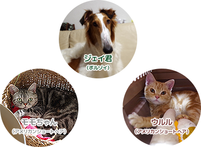 - 猫のモモとウルル、犬のジェイ